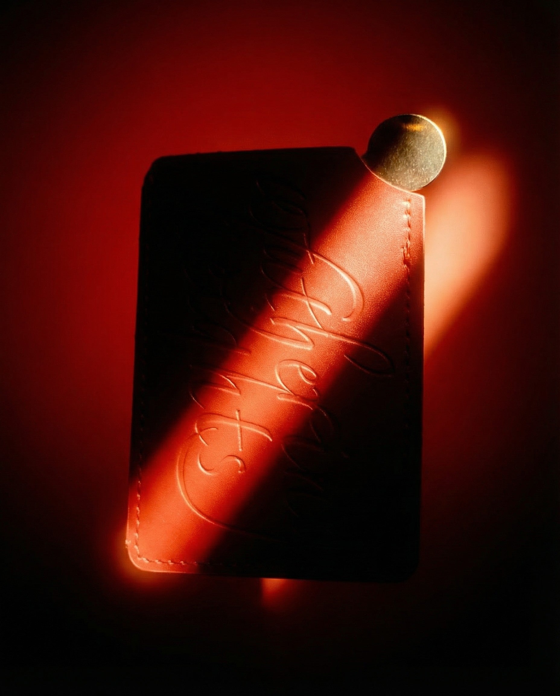 A specially designed mirror contained in a deep, blood-red synthetic leather case. Both the case and mirror back have "Wuthering Heights" embossed in a bespoke typography like a talisman—a reminder that beauty and longing are forever intertwined.